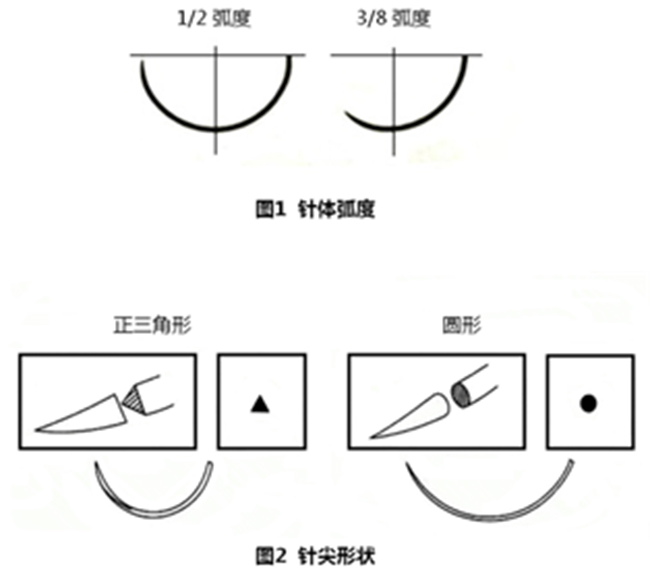 缝合针结构:由针孔(针眼)、针体和针尖三部分组成。按针体弧度分3/8和1/2两种,如图1所示;按针尖形状分圆形(用●符号表示)和正三角形(用▲符号表示)两种, 如图2所示。